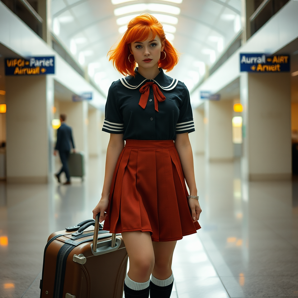Aurora, artfully coiffed with vibrant orange tresses, clad in a nostalgic schoolgirl ensemble complete with pleated skirt and knee-high socks, lingers mid-shot amidst an airport interior, suitcase at her side, radiating an ethereal presence reminiscent of a captivating portrait, a symphony of light and shadow evoking the essence of Harriet Powers' timeless genre-bending style.