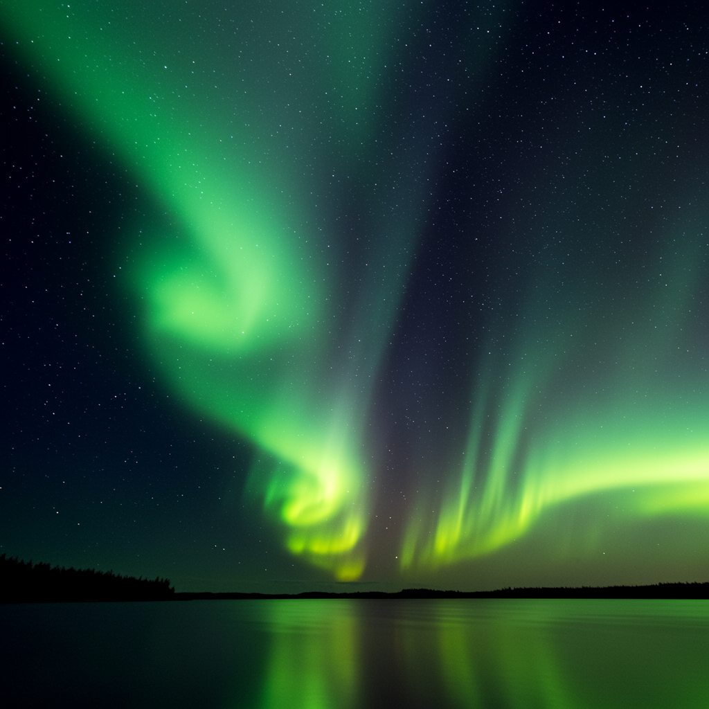 Aurora borealis glows vividly under a star-studded night sky, captured with stunning photorealism, the vibrant colors flowing gracefully across the horizon. Shot on 65mm film with a long exposure to highlight the ethereal lights, the scene showcases the mesmerizing dance of colors in a striking vertical aspect ratio of 9:16, ensuring an immersive experience. A gentle lake reflects the celestial display, adding depth and tranquility to this hyper-realistic masterpiece.