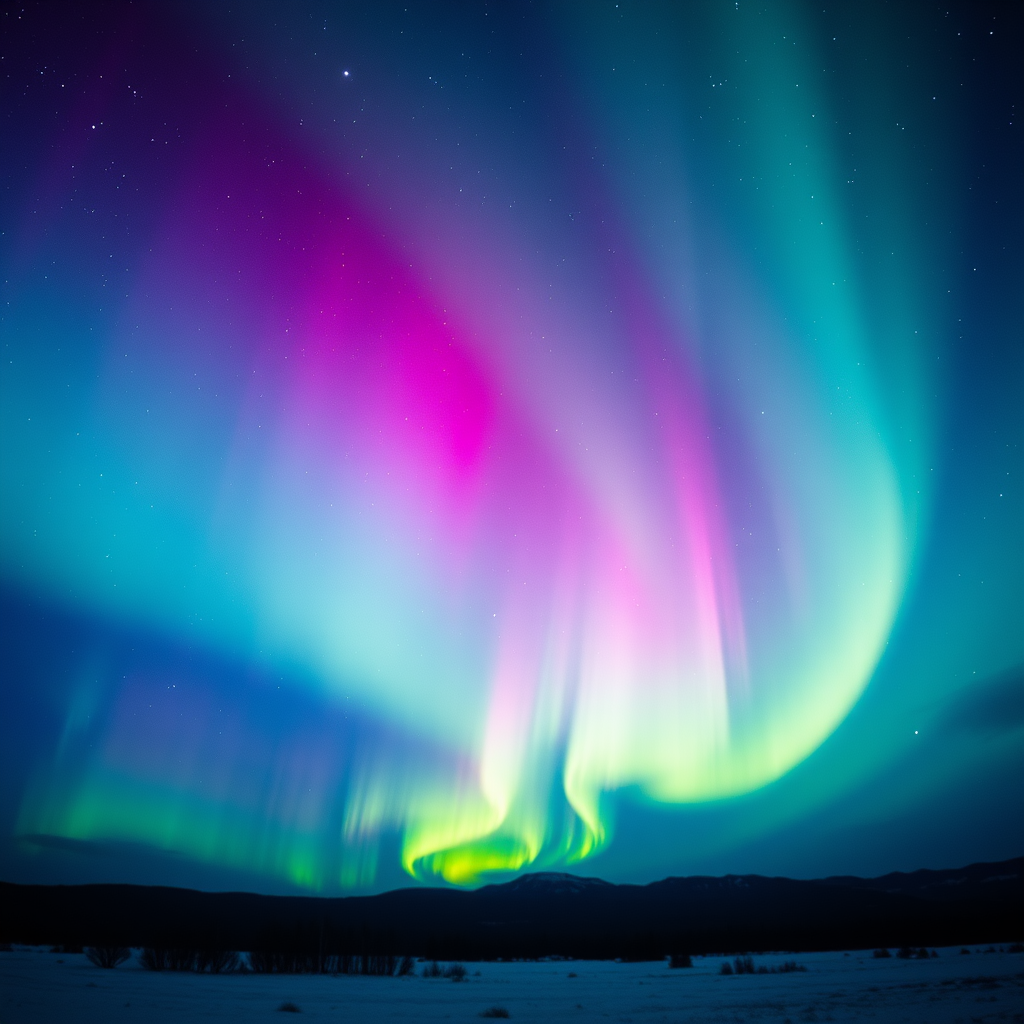 Aurora borealis illuminating the vast night sky with vibrant colors, stars twinkling in the background, depicted in a hyper-realistic photorealism style, captured using 65mm film with a long exposure to enhance detail, aspect ratio 9:16, quality level 2 version 4, set in a serene, untouched natural landscape.