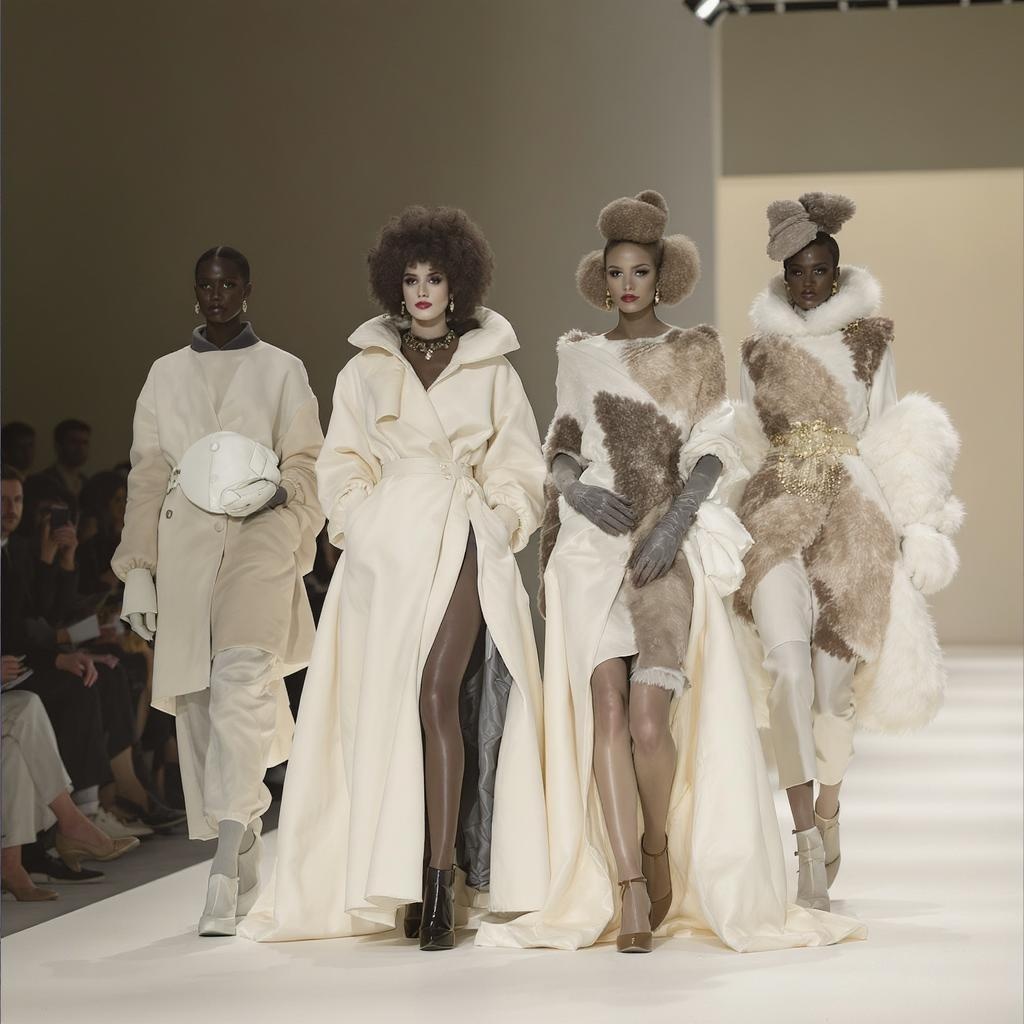 Autumn 2017 Paris Fashion Week captured through the lens of an Irving Penn-inspired vision, blending a palette of ivory with a whimsical twist of poodlepunk aesthetics. Envision garments echoing the elegance of the 1860s to the sophistication of the 1960s, interwoven with the tactile allure of leather and hide, reminiscent of Richard Doyle's fantastical illustrations. Ready-made fashion emerges in this scene, characterized by a raw, unfiltered style that evokes both a sense of nostalgia and avant-garde flair. The composition presents elongated silhouettes with an aspect ratio of 2:3, emphasizing the vertical grace of the ensemble.