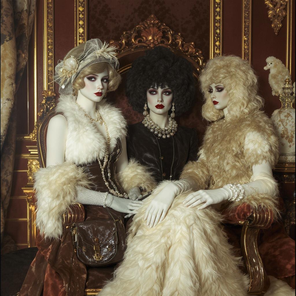 Autumn 2017 Paris Fashion Week inspired scene, captured in the essence of Irving Penn, featuring ivory hues intertwined with poodlepunk aesthetics. The composition draws upon the opulence of the 1860–1969 era, enriched by the textures of leather and hide. Elements reminiscent of Richard Doyle’s whimsical illustrations dance alongside ready-made fashion pieces, all brought to life in a raw, unfiltered style with a portrait-like 2:3 aspect ratio.