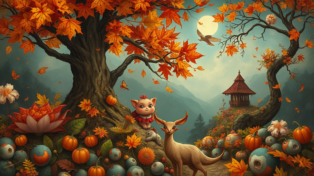 Autumn fantasy art, digital painting, reminiscent of Sophie Wilkins, Irene Sheri, Naoto Hattori, pointillism, stylish illustrations, rich brushwork, vintage 1970s vibe, vibrant foliage, whimsical characters, surreal elements, warm earthy tones, enchanting atmosphere, intricate details, expressive and dynamic composition.
