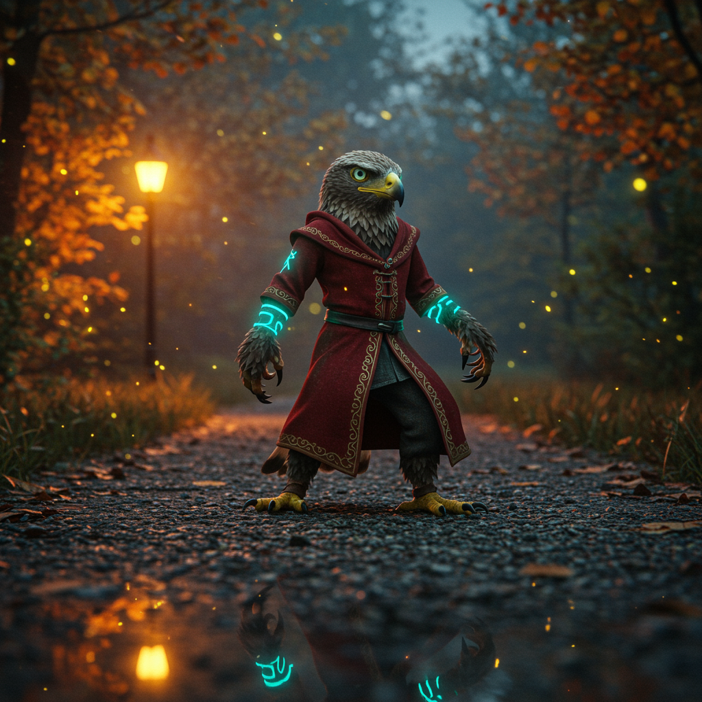 A magical autumn forest surrounds an eagle hunter on a gravel path. The hunter wears a red intricately ornamented robe, and their humanoid form is adorned with blue-green glowing neon runes. Captured from a low angle, the scene showcases a highly detailed eagle head with intense glowing eyes. This realistic photograph features reflections and a nearby lamppost casting a warm glow. The hunter strikes a dynamic pose, surrounded by fireflies that dance in the dusk. The character is a hybrid of eagle and human, with a uniquely endearing appearance. The scene is muted in color but exudes a friendly and whimsical charm. While the proportions are unexpected, with fused fingers creating an almost mythical aura, the overall composition remains captivating and deeply imaginative.