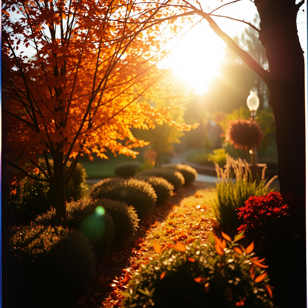 Autumn Garden Scene, soft focus, cinematic graininess, 35mm, Fujifilm Pro, sunlit reflections, cozy color scheme, bright setting, --ar 4:5