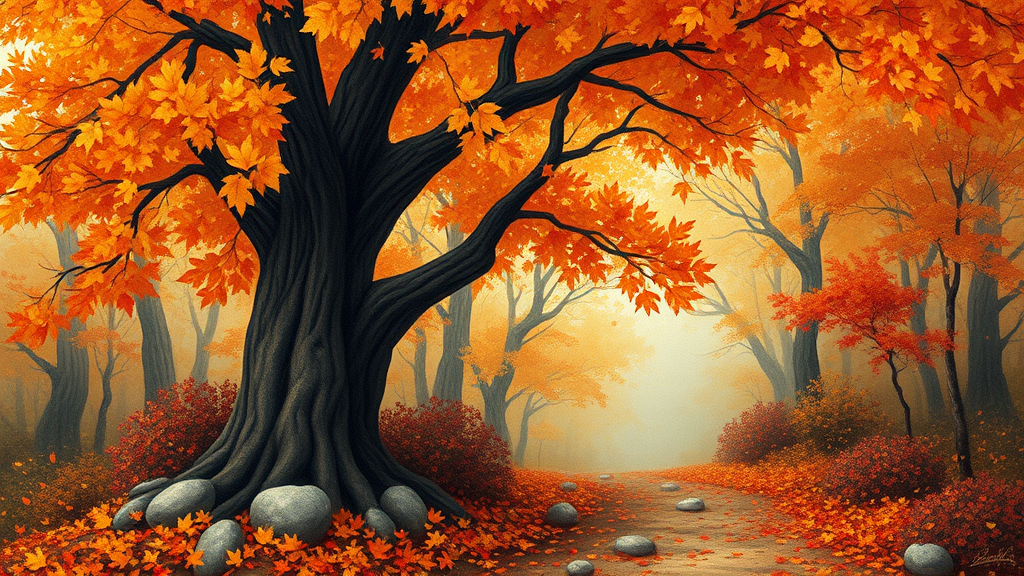 Autumn-inspired digital painting, capturing the essence of fall, blending the styles of Sophie Wilkins, Irene Sheri, and Naoto Hattori. Embrace pointillism with chic, lush brushstrokes, evoking a 1970s aesthetic. The artwork should be a harmonious fusion of rich autumn colors, intricate details, and a whimsical atmosphere, inviting viewers to immerse themselves in the enchanting beauty of the season.