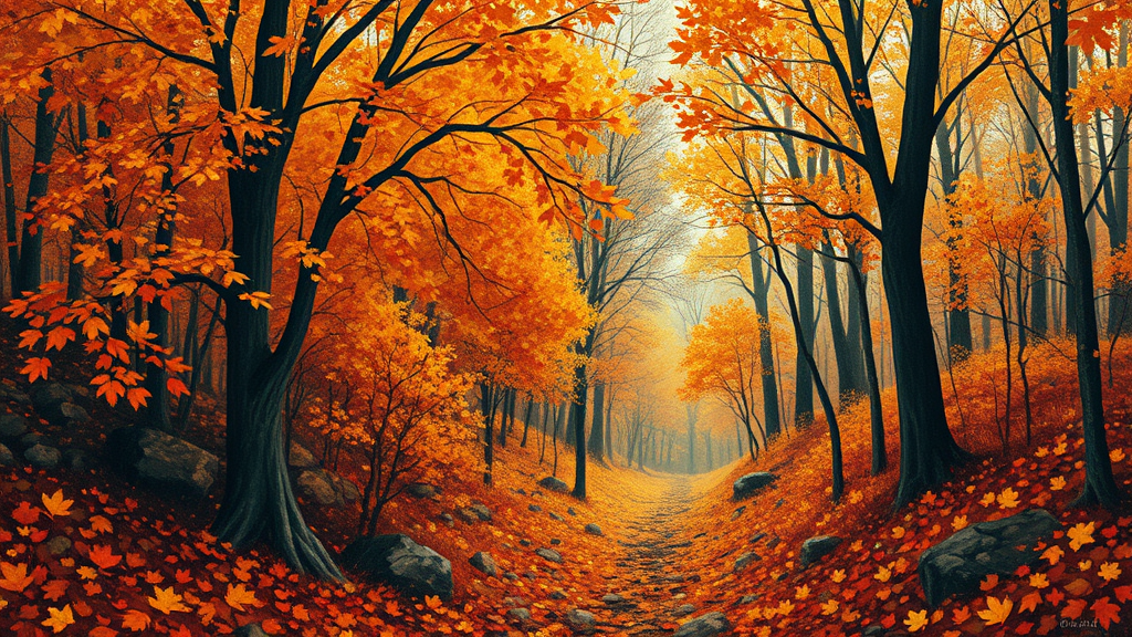 Autumn-inspired visual masterpiece, digital artwork, reflecting the artistic essence of Sophie Wilkins, Irene Sheri, Naoto Hattori, blended with a pointillist touch and chic illustration flair. Embrace opulent brushstrokes and a vintage 1970s aesthetic, conjuring a tapestry of vibrant fall hues. The scene captures the enchanting allure of a woodland landscape, where golden leaves cascade like whispers on the wind, creating a textured symphony of color and form. Intricate details and a serene atmosphere invite the viewer to explore the depths of this nostalgic and dreamlike vista.
