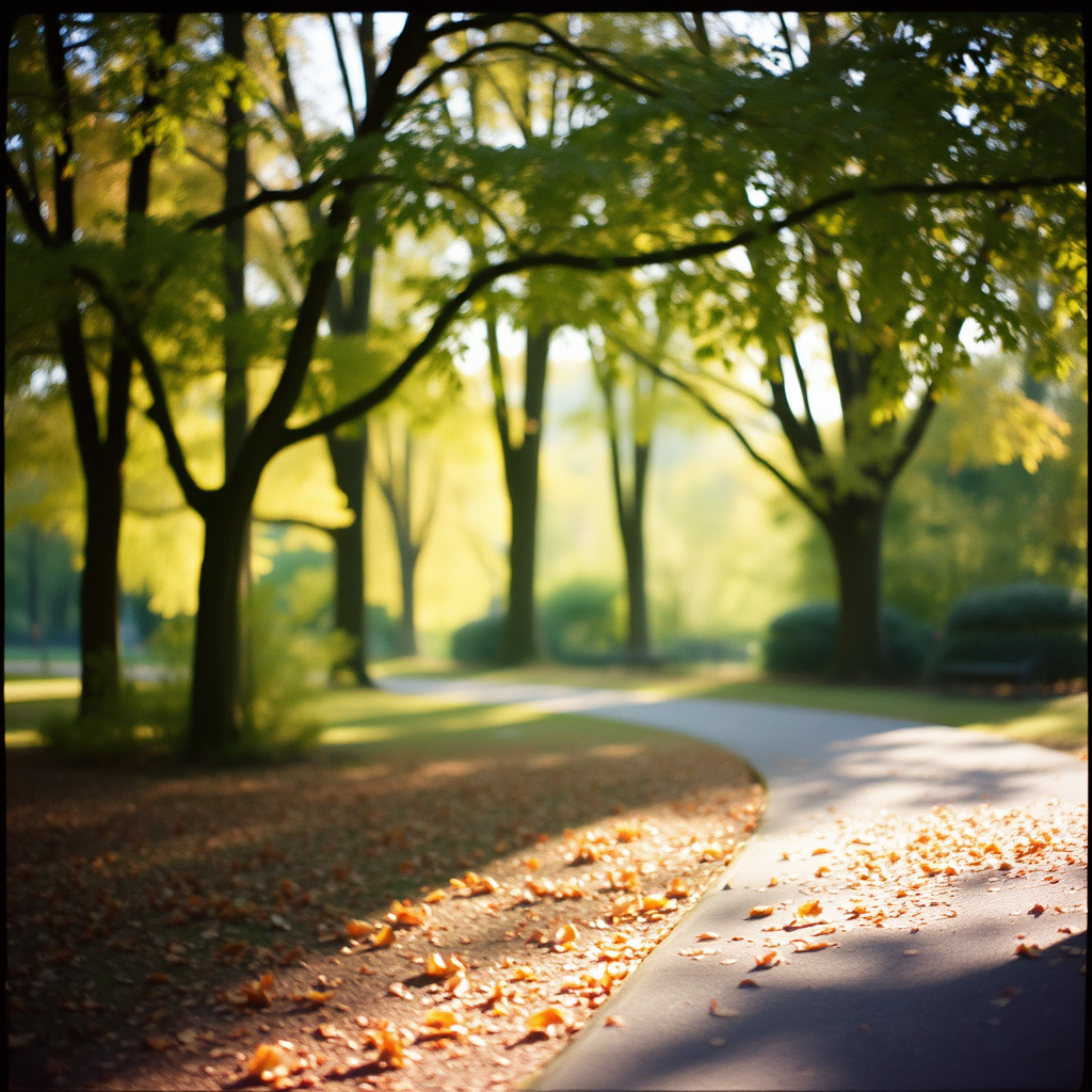Autumn Park Scene, Soft Focus, Film Texture, 35mm Film Style, Kodak Ektar, Sunlight Glare, Cozy Hues, Bright Lighting, --aspect ratio 4:5