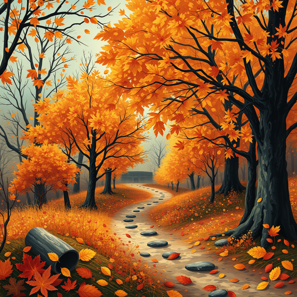 Autumn-themed digital artwork, blending the enchanted style of Sophie Wilkins and Irene Sheri with Naoto Hattori's imaginative flair. Incorporate pointillism techniques and chic artistry, emphasizing lush brushstrokes reminiscent of 1970s aesthetics. Include vibrant fall colors and whimsical elements that evoke a sense of warmth and nostalgia.
