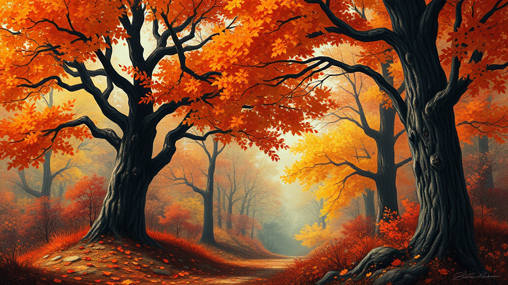 Autumn-themed masterpiece, digital painting, blending influences from Sophie Wilkins, Irene Sheri, and Naoto Hattori, reminiscent of pointillist techniques and chic illustrations, with luxurious brushstrokes and a nod to 1970s aesthetic, a tapestry of vivid colors and intricate details, capturing the essence of fall in a harmonious and enchanting composition.