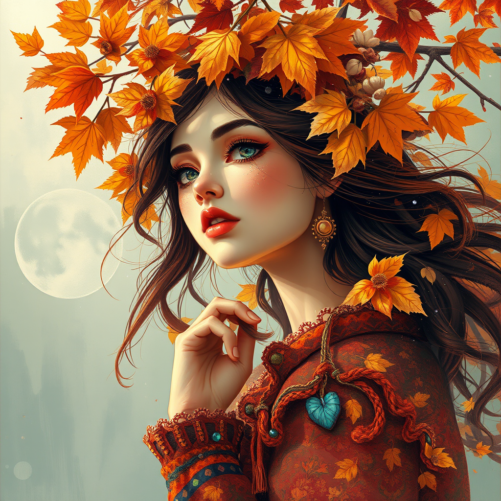 Autumnal fantasy illustration, digital painting, echoing the styles of Sophie Wilkins, Irene Sheri, and Naoto Hattori, infused with pointillist detail and chic aesthetics, featuring lush and vivid brushstrokes. Inspired by the vibrant, nostalgic palette of the 1970s, the artwork captures the essence of fall's ethereal beauty, with an emphasis on intricate textures and harmonious colors.