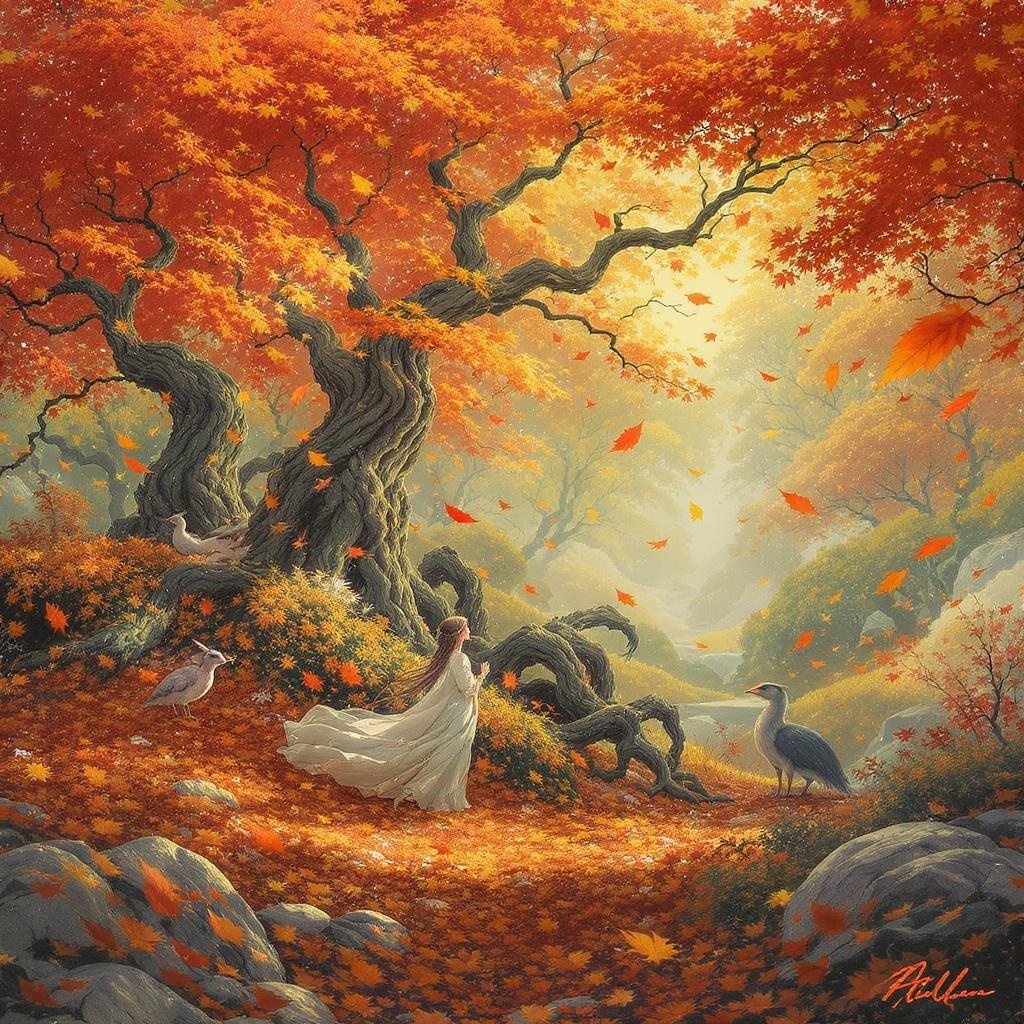 autumnal fantasy landscape, digital painting, influenced by the styles of sophie wilkins, irene sheri, and naoto hattori, features intricate pointillism, elegant illustration, vibrant brushwork, reminiscent of 1970s art aesthetic, detailed leaves falling amidst whimsical creatures, warm and rich color palette, play of light and shadow creating a dreamlike atmosphere