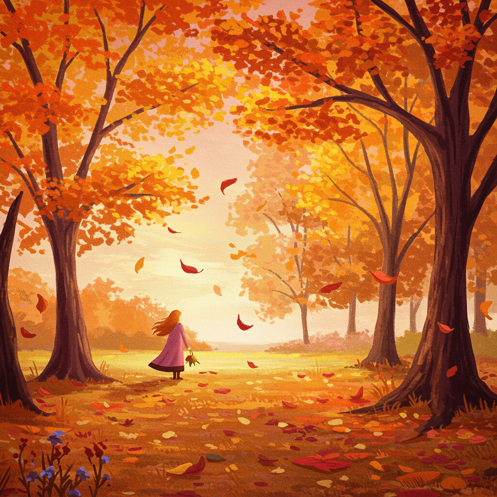 Autumnal fantasy scene, digital painting infused with the essence of Sophie Wilkins, Irene Sheri, and Naoto Hattori, blending pointillist details with chic, retro 1970s vibes, characterized by lush, flowing brushstrokes.