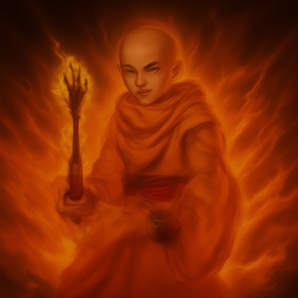 Avatar Aang from The Last Airbender, rendered in the style of furaffinity with a focus on massurrealism and spiritualcore. He's wearing signature orange robes with accents of red, complemented by an electrifying bioluminescent arrow. The scene is infused with explosive pigmentation and cinematic lighting, capturing a sense of dynamic energy. The portrait is highly detailed and photorealistic, presented in 8k sharp focus.