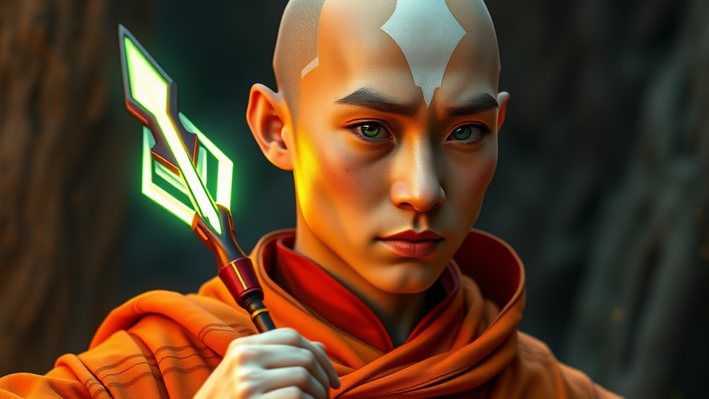 Avatar Aang in a furaffinity-inspired style, wearing orange robes with red accents, featured in a #vfxfriday scene with massurrealism elements and explosive pigmentation. Spiritualcore themes imbue the scene with a sense of peace and harmony, enhanced by cinematic lighting. His bioluminescent arrow glows vibrantly, adding a mystical touch. The portrait is rendered in photorealistic detail, with 8k sharp focus, capturing the essence of Aang in a highly detailed and immersive way. The depiction avoids low quality attributes, ensuring anatomical accuracy and a clear, defined composition, celebrating Aang’s spiritual journey and wisdom.