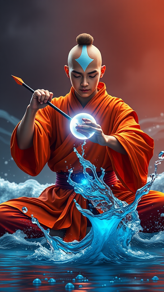 Avatar Aang in the style of Furaffinity, featuring orange robes, red hues, and a massurrealism touch with explosive pigmentation. He embodies spiritualcore with cinematic lighting, showcasing a bioluminescent arrow. Aang is depicted in a martial arts meditative pose with photorealism. In the scene, he performs water bending, with a flowing orb of water and a background of water in motion, highlighted with blue bioluminescence. The image boasts high detail, 8k sharp focus, capturing an essence of tranquility and mastery. Adjustments include creative elements that enhance the central theme, ensuring clarity and precise anatomy without unnecessary limbs or distortions, and maintaining an overall balanced composition for a coherent visual narrative.