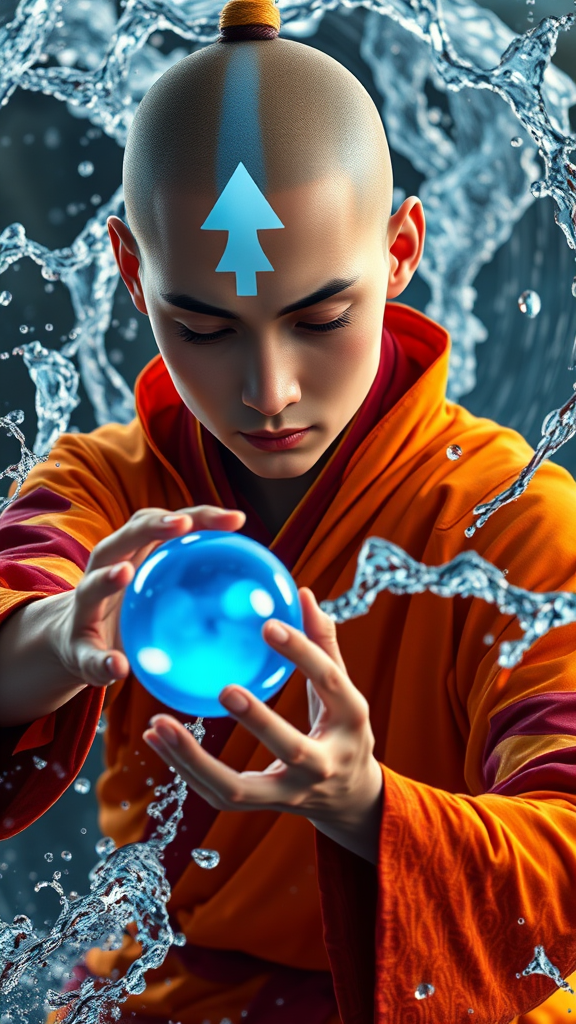 Avatar Aang in the style of furaffinity, wearing orange robes with red accents, featured in a massurrealism theme with explosive pigmentation. He is depicted in a martial arts meditative pose with spiritualcore and cinematic lighting, showcasing a bioluminescent arrow on his forehead. The focus is on photorealism with Aang performing water bending. Water flows dynamically in the background, and a water orb shows a blue bioluminescent effect. The scene is highly detailed in 8k sharp focus, capturing the essence of meditative balance and power.