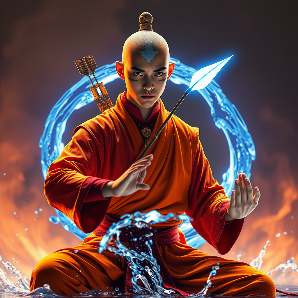 Avatar Aang in the style of furaffinity, wearing vibrant orange robes with red accents, depicted with #vfxfriday flair and massurrealism aesthetics. The scene is filled with explosive pigmentation and spiritualcore elements, enhanced by cinematic lighting. Aang's iconic bioluminescent arrow adds a mystical glow. He is posed in a martial arts meditative stance, captured in photorealism, while showcasing his water bending skills. A graceful flow of water forms an orb in the background, illuminated with blue bioluminescence. The image is rendered in high detail and sharp focus, emphasizing realism and clarity, free from any imperfections or distortions.