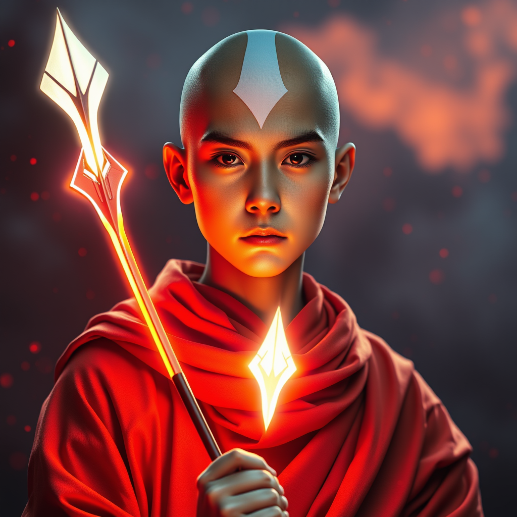 Avatar Aang, the last airbender, depicted in a Furaffinity-inspired style, wearing flowing orange robes intertwined with hints of rich red. His bioluminescent arrow glows brightly, casting a spiritual aura. The scene bursts with explosive pigmentation, embracing a massurrealism influence. The composition is enveloped in cinematic lighting, enhancing the photorealistic and highly detailed 8k sharp focus of the portrait. The essence of spiritualcore emanates through Aang's tranquil expression, featuring a flawless anatomy and harmonious positioning. A sense of dynamic energy flows, captured in sharp and clear detail, devoid of any anomalies, emphasizing beauty and balance. The rendering maintains an immaculate center, showcasing perfect composition and leaving out any unnecessary elements or distortions.
