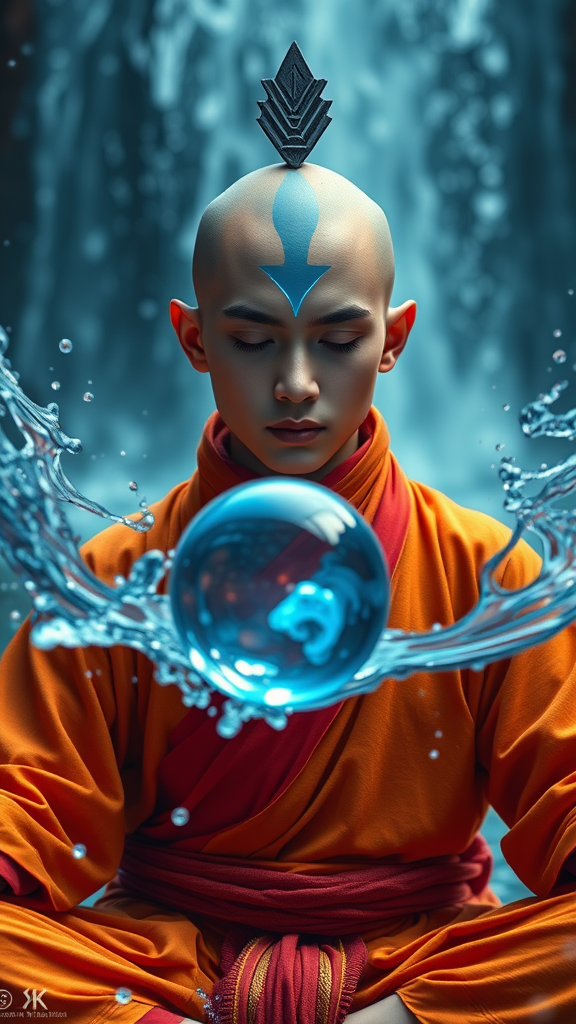 Avatar Aang, the last airbender, depicted in a style reminiscent of Furaffinity, wearing traditional orange robes with red accents and featuring a bioluminescent arrow on his forehead. He is portrayed in a meditative martial arts pose, surrounded by water bending elements with water flowing in the background and an orb of water suspended in the air. The scene is captured with 8k sharp focus and cinematic lighting, emphasizing explosive pigmentation and spiritual core themes. The bioluminescent elements glow in hues of blue, adding to the massurrealism atmosphere. The composition maintains a highly detailed, photorealistic style without any visual distractions such as low quality or incorrectly rendered features.