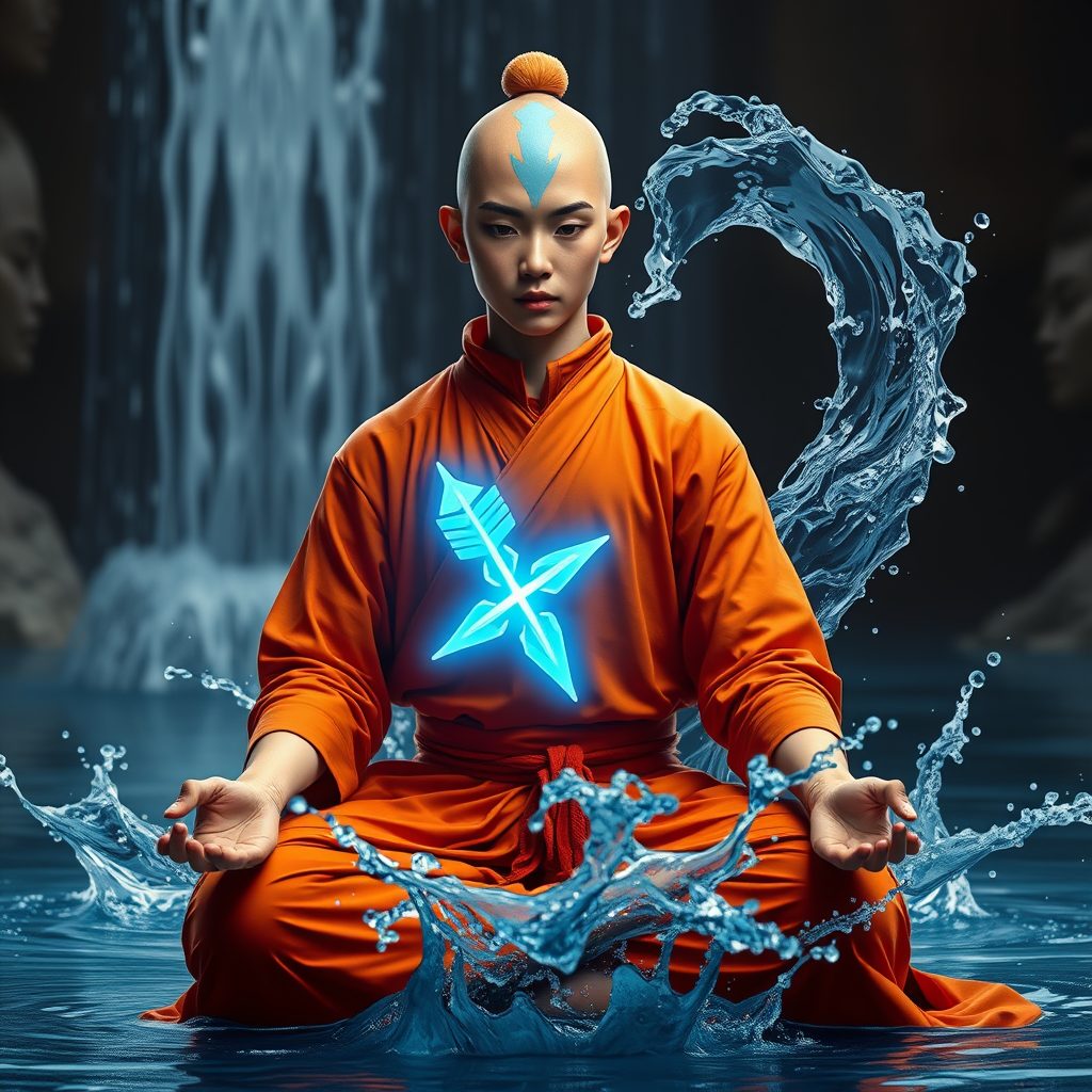 Avatar Aang, the last airbender, in a style influenced by Furaffinity, wearing orange robes with red accents, featuring massurrealism elements and explosive pigmentation. The scene is imbued with spiritualcore energy and cinematic lighting, showcasing Aang in a martial arts meditative pose. Photorealistic water bending is depicted with dynamic water flowing in the background, forming a flowing orb with blue bioluminescence. The iconic bioluminescent arrow on Aang's body glows brightly. The composition is in 8k sharp focus with highly detailed art, ensuring all features are realistic and anatomically correct, avoiding any anomalies such as extra limbs or misplaced features. A harmonious and well-composed scene captures the essence of Aang's serenity and power, with no distracting elements like text logos, watermarks, or signatures.
