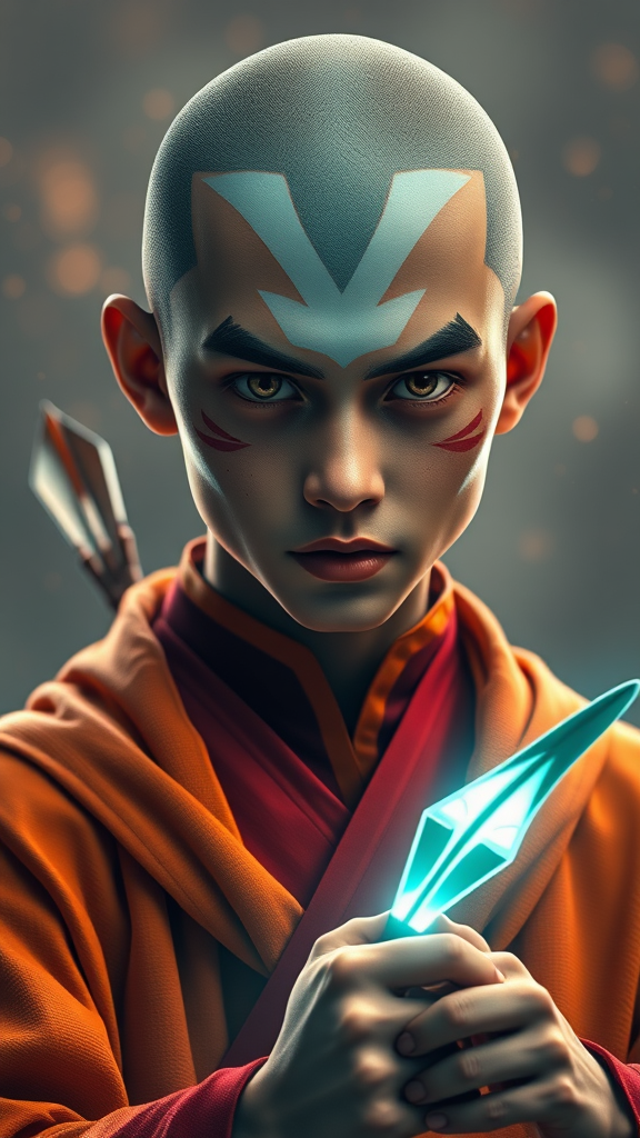 Avatar Aang, the last airbender, in the style of furaffinity, wearing orange robes with red accents, featuring massurrealism, explosive pigmentation, spiritualcore elements, and cinematic lighting, showcasing a bioluminescent arrow, portrait in photorealism with highly detailed 8k sharp focus, avoiding low quality attributes, text logos, watermarks, signatures, out of frame errors, and ensuring there are no artifacts, ugly features, or poorly drawn aspects. Keep anatomy realistic without extra limbs, hands, feet, backward limbs, extra fingers, toes, or incorrect anatomy. Avoid cut off body parts, strange or impossible body positions, mismatched eyes, cross eyes, crooked facial features, unclear or undefined areas, mutations, deformities, off-center composition, poor composition, duplicates, or bad-hands.