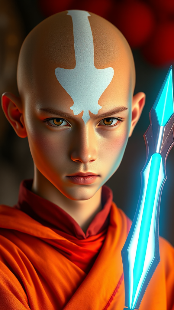 Avatar Aang, the last airbender, styled after furaffinity, wearing orange robes with red accents, showcasing #vfxfriday with massurrealism and spiritualcore elements. The scene is vibrant and features explosive pigmentation with cinematic lighting. Aang's bioluminescent arrow glows vividly. The portrait is rendered in photorealistic detail with an 8k sharp focus, capturing the essence and spirit of the character. Creative modifications highlight a fusion of traditional and fantastical aesthetics, maintaining the core concept while avoiding off-putting elements such as low quality or inaccurate anatomy, ensuring a harmonious and captivating depiction.