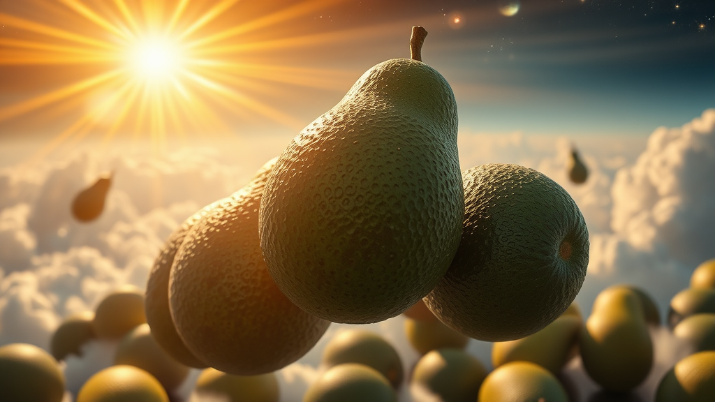 Avocados floating in the celestial waiting room to heaven, bathed in divine god rays, dramatic cinematic lighting enhancing their features, exquisitely intricate details, a touch of genius artistry, ultra-high resolution 8k quality, surrounded by ethereal clouds, profoundly beautiful atmosphere.