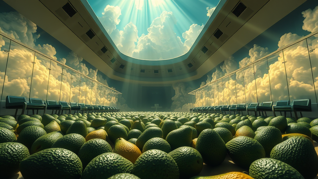 Avocados scattered throughout a celestial waiting room, illuminated by divine rays with cinematic lighting, featuring intricate and beautiful details, embodying genius and wonder, set against a backdrop of billowing clouds in stunning 8k resolution.