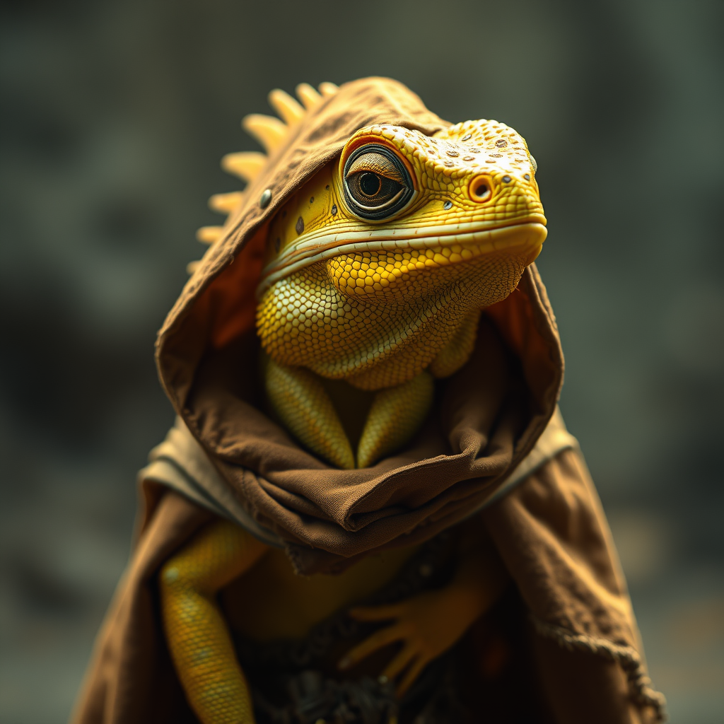 award-winning cinematic film still of a charming yellow iguana adorned in a weathered cultist cloak, full-body portrait. The composition features a shallow depth of field with a subtle vignette, capturing finely detailed textures and a high-budget aesthetic. Bokeh highlights create a dreamy cinemascope atmosphere, while the moody and epic lighting emphasizes the iguana's intriguing presence. The scene is enhanced with a gorgeous film grain, adding a touch of artistic elegance to the grainy imagery.