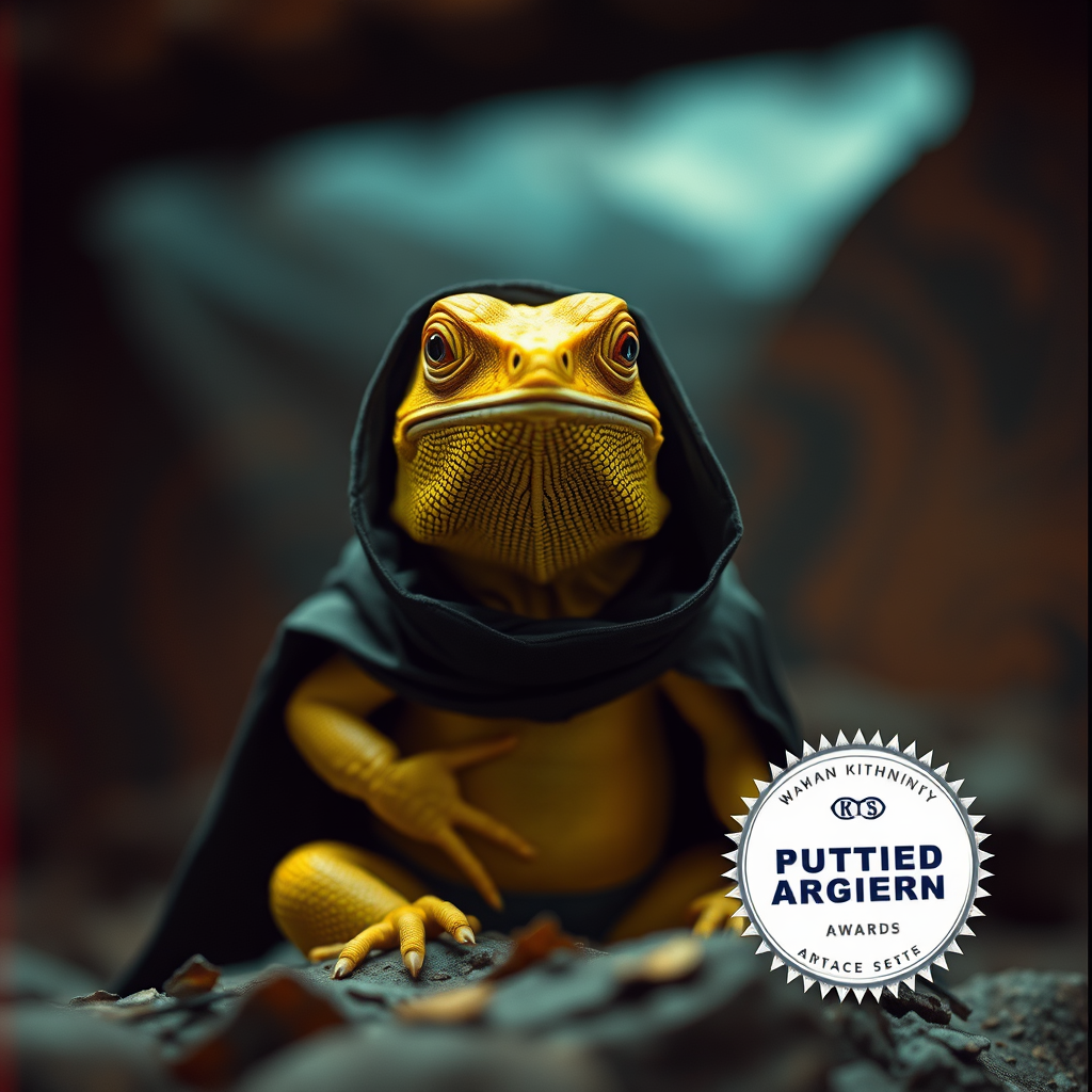 Award-winning cinematic photo of a charming yellow iguana draped in a mystical cultist cloak, surrounded by a rich, rusty backdrop. The scene presents an epic full-body composition with a shallow depth of field and soft vignette, capturing intricate details with a high-budget aesthetic. The bokeh effect adds a dreamy quality, while the cinemascope format enhances the moody and mesmerizing atmosphere. The image exudes an epic and captivating allure with a touch of film grain for a timeless, textured feel.