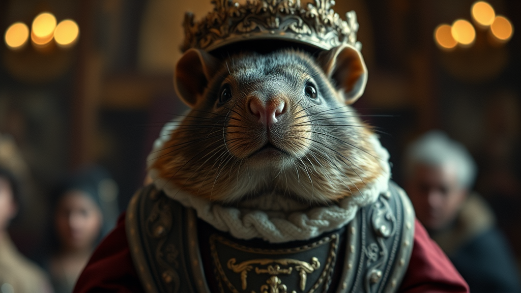 Award-winning cinematic photo of a charmingly snooty, stocky brown mole adorned in medieval royal attire, captured in a full-body shot. The scene is set with a moody, epic atmosphere, accentuated by a shallow depth of field and a soft vignette. The image is highly detailed, reflecting a high-budget production, enhanced by subtle film grain and a delicate bokeh effect. The composition is reminiscent of cinemascope, offering a grainy, gorgeous portrayal that conveys an air of regal antiquity and whimsical charm.