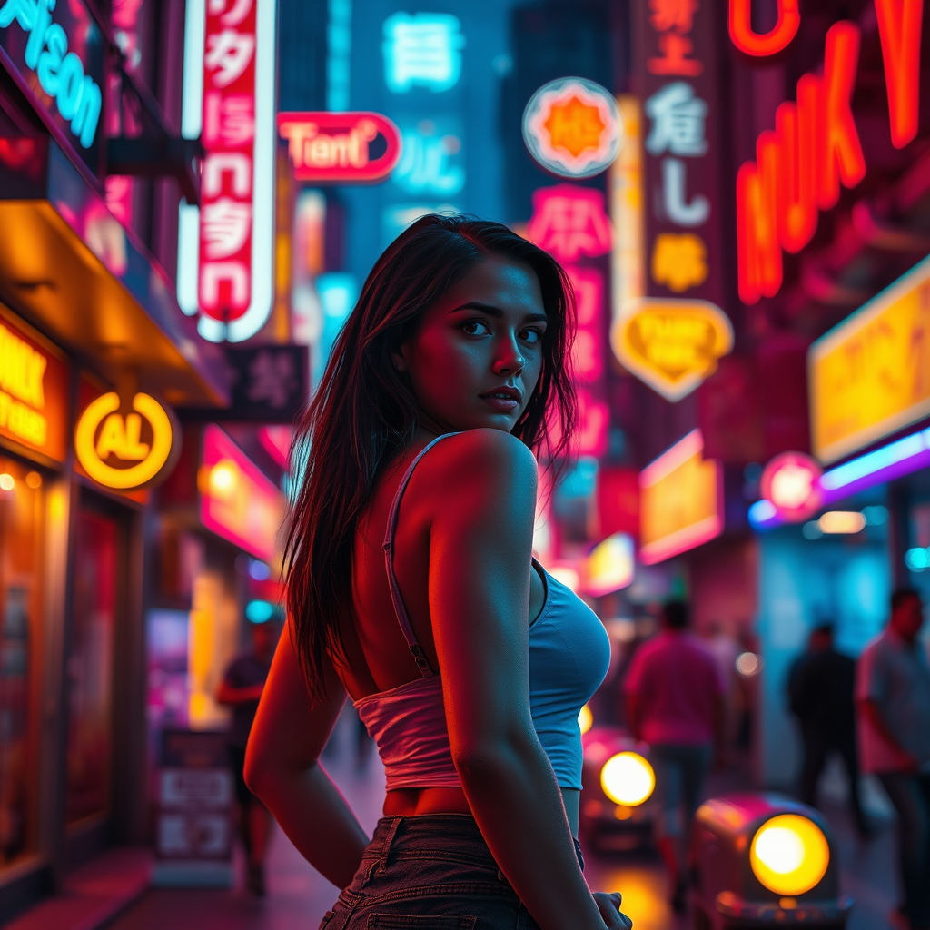 Award-winning cinematic photograph of a woman poised confidently on a bustling Cyberpunk city street, amidst the vivid glow of neon signs and flickering lights reminiscent of Cyberpunk 2077. The scene is bathed in a kaleidoscope of neon colors, casting a synthwave ambiance over her. The bokeh background captures the essence of the city's pulse, with vivid layers of depth and intrigue.