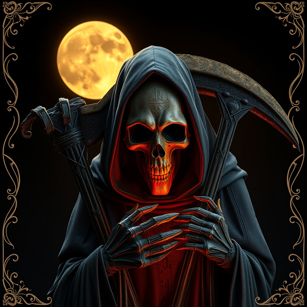 Award winning dark studio photo of the grim reaper, eerie moonlit filigree, high contrast, hellfire glow, zbrush sculptris, nrealfixer, nfixer, metal oxide shader, torchlight render, altarpiece painting, gruesome illustration