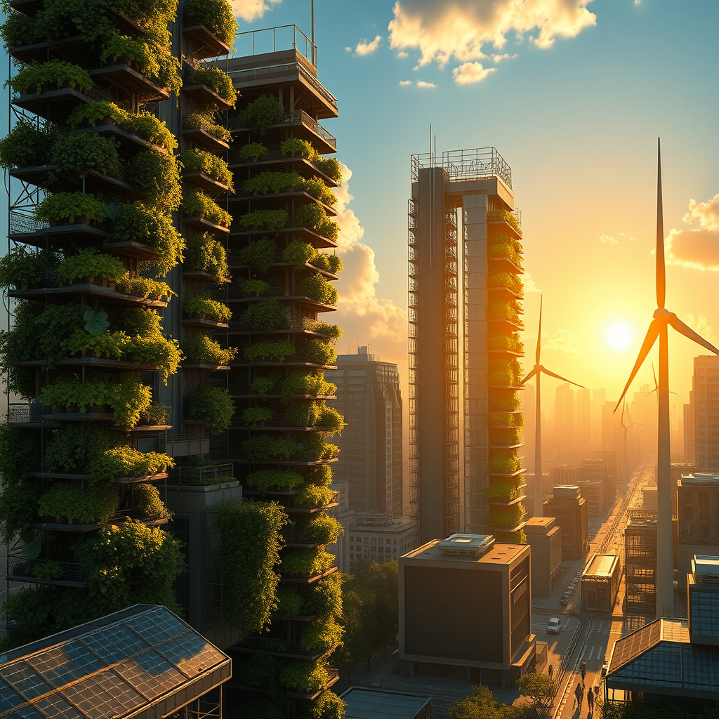 Award-winning depiction of a solarpunk cityscape featuring towering vertical gardens and golden sunlight filtering through advanced solar panels, showcasing an ecologically sustainable environment. The scene includes intricately detailed wind turbines against a vibrant city background, embodying visionary futurism reminiscent of Hayao Miyazaki's style. Captured with a Nikon D850 and using film stock photography with an f1.6 lens, the image boasts rich colors, hyper-realistic and lifelike textures with dramatic lighting. Utilizing Cinestill 800 for vibrant contrast, the composition is bright and striking. Despite being low resolution with potential jpeg artifacts, the focus is on the artistic vision without distortion or deformities such as extra limbs or disfigured anatomy. The image maintains clarity with no watermarks, presenting a captivating and uplifting future vision in harmony with nature.