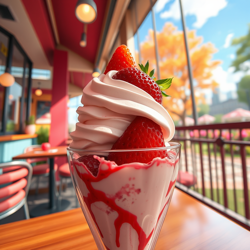Award-winning extreme close-up of a strawberry ice cream sundae, shot from below, centered and focused, capturing the rich textures, set against a vibrant cafe interior with an afternoon city park visible in the background. Dynamic lighting enhances the depth of field, lending an ultra-detailed, Instagram-worthy aesthetic. In the style of Makoto Shinkai, this 2D illustration combines professional artwork with a panoramic view to create a visually captivating scene.