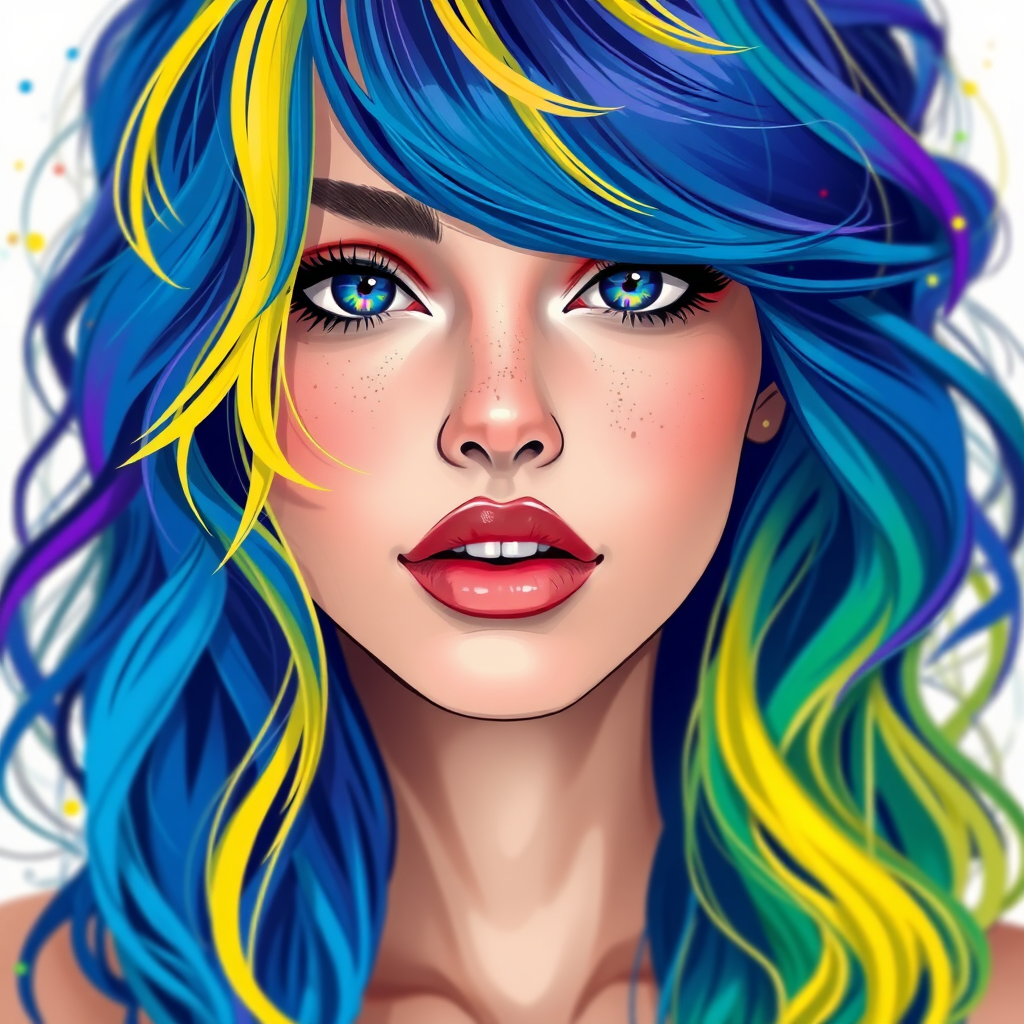 Award-winning half body portrait of a stunning woman with a vibrant ombre hairstyle featuring shades of blue, yellow, green, and purple in curly locks, intricately detailed hair with a dynamic splash of paint, realistic skin texture showcasing pores, expertly shaded in a flat illustration style, digital art highly trending on artstation, meticulously detailed with fine cartoon elements, 3D effects, peculiar color combinations, and a slightly blurry aesthetic for an artistic touch.