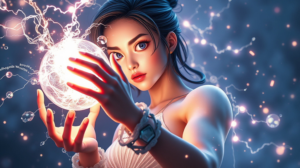 Award-winning illustration, a figure of a young woman holding a glowing electric energy sphere, intertwined with clear crystal elements, surrounded by dynamic particles; the style is reminiscent of 3D animations akin to Dragon Ball Z, featuring extreme detail and a cinematic composition. The scene is illuminated with ambient light, rendered using advanced techniques like Unreal Engine and Octane, presented in stunning 16k UHD HDR quality. The artwork avoids imperfections such as cloned faces, crossed eyes, or mutated hands. It is carefully crafted to avoid cropping, low resolution, text overlays, jpeg artifacts, signatures, watermarks, usernames, artist names, trademarks, or titles. The composition is thoughtfully contained within the frame, showcasing a balanced, elegant portrayal with no unusual proportions.