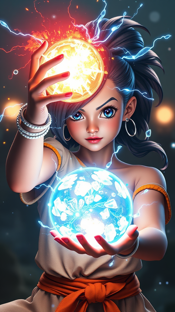Award-winning illustration, a powerful girl holding a vibrant electric energy ball with shimmering clear crystals and dancing particles, styled in a 3D dragon ball Z aesthetic, featuring extreme detail. The scene is set in a cinematic composition with ambient lighting as if rendered in Unreal Engine and Octane. The image boasts a 16k UHD HDR resolution, showcasing a dynamic portrayal without cloned or distorted features. The illustration maintains focus, avoiding cropping, low resolution, or artifacts. There are no signatures, watermarks, or textual elements, ensuring a clean presentation. The depiction captures a strong presence without elongated features, maintaining the character within the frame.