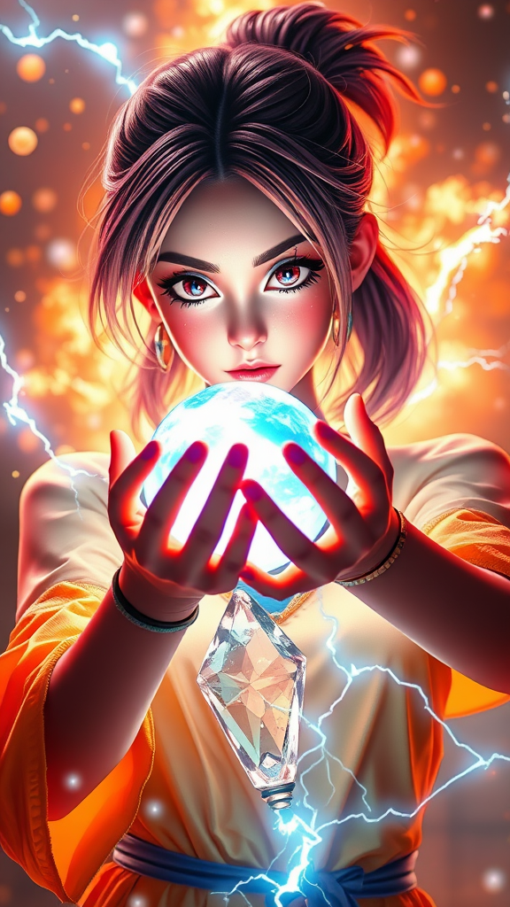 Award Winning Illustration, featuring a young woman holding a vibrant electric energy sphere, surrounded by shimmering particles and a clear crystal. The scene is rendered in the dynamic and vibrant style of 3D Dragon Ball Z, showcasing extreme detail and a cinematic composition. Ambient lighting enhances the atmosphere, utilizing advanced rendering techniques like Unreal Engine and Octane. The image possesses a resolution of 16k UHD HDR, capturing every nuance of the scene. Extra elements such as cloned faces, cross-eyed look, and additional fingers add a surreal twist, while the composition avoids unnecessary cropping, low resolution, and typical artifacts like text, signatures, watermarks, or artist names. Certain creative liberties are taken to modify features like elongated necks and out-of-frame perspectives, enhancing the original concept's uniqueness.