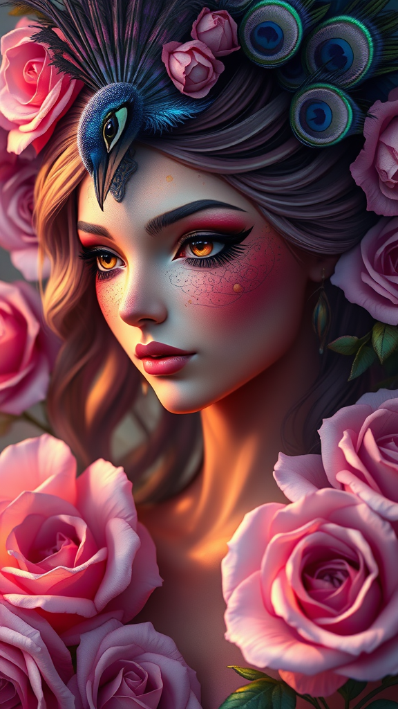 Award winning Illustration of a peacock fairy goddess surrounded by purple roses, captured in a detailed facial closeup featuring warm lighting and extreme detail with 16k UHD HDR quality. She possesses otherworldly beauty with delicate features and vibrant colors. Her mystical presence is highlighted by intricate patterns on her skin and a majestic blend of peacock feathers. The scene is devoid of any deformed features and maintains symmetry and grace. No signatures, watermarks, or extraneous artifacts are present. The composition is central, focused, and uncropped, capturing a sense of ethereal elegance and timeless allure.