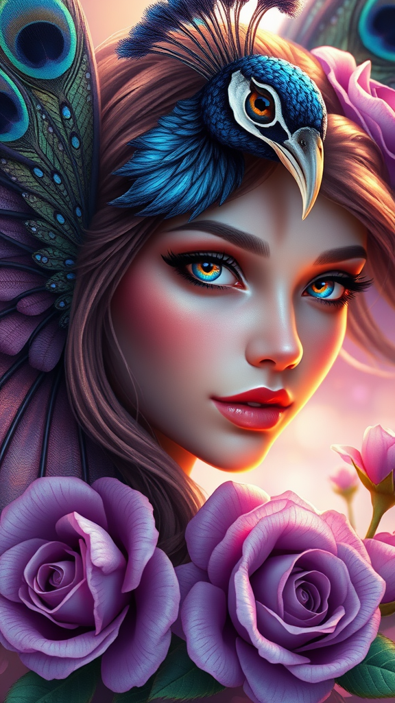 Award-winning illustration of a peacock fairy goddess adorned with purple roses, featuring a captivating facial closeup. The artwork is imbued with warm lighting and displays extreme detail in 16k UHD HDR. The fairy goddess exudes enchanting beauty with ethereal features. Her eyes glisten with mystical allure, and her delicate visage is framed by flowing, iridescent peacock feathers. The intricate patterns of her wings and the lush texture of the purple roses create a harmonious blend of color and form. The composition captures the essence of fantasy and divinity, inviting viewers into a world of wonder and magic, all rendered with an impeccable level of detail and artistic finesse.