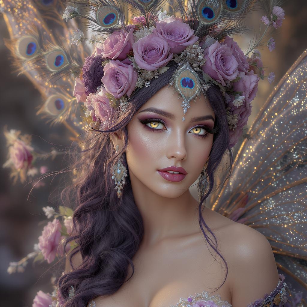 Award-winning illustration of a peacock fairy goddess with purple roses, featuring a facial closeup illuminated with warm lighting and highlighting extreme detail in 16k resolution with UHD and HDR effects. The artwork displays unique characteristics such as unconventional iris shapes, intriguing pupils, and an enchanting gaze. It portrays an ethereal beauty with a mysterious allure, while the absence of typical flaws enhances its captivating charm. The scene is artistically cropped to emphasize the subject’s elegance, and the composition is free from any distracting text, signatures, or artifacts, alluding to an original, untitled masterpiece. The illustration focuses on the goddess's graceful presence and delicate posture, encapsulating an otherworldly essence.