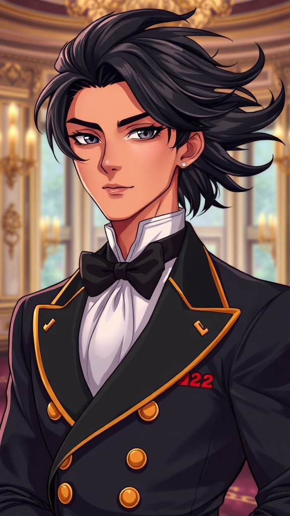Award-winning illustration of a sophisticated young man with flowing ebony hair and deep black eyes, exuding an aristocratic elegance in a meticulously tailored uniform. His youthful age of 22 complements his striking handsomeness and stylish demeanor. The illustration is crafted with impeccable quality and attention to detail, capturing colorful nuances in a vibrant animation style. Set against the luxurious backdrop of a grand mansion, the scene is rendered in stunning 16k UHD HDR, creating a mesmerizing masterpiece that balances realism with dreamlike elements.