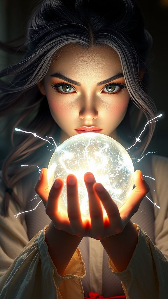 Award Winning Illustration of a young woman holding a glowing electric energy ball with shimmering particles, surrounded by a clear crystal aura. Inspired by the 3D style of Dragon Ball Z, the scene features extreme detail with a cinematic composition. The ambient lighting creates a dynamic atmosphere, rendered using Unreal Engine and Octane for a 16k UHD HDR output. The character's features are expressive, with a touch of fantasy. Her gaze is intense and focused, with gracefully flowing hair that adds movement to the scene. The setting itself is ethereal and immersive, devoid of any extraneous elements like signatures or watermarks. The overall composition emphasizes a sense of power and mystique, highlighted by precise and realistic rendering, maintaining clarity and depth throughout.