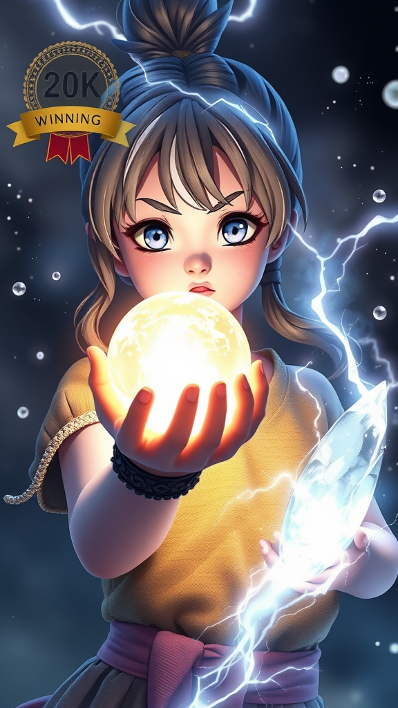 Award-winning illustration, one girl holding a glowing electric energy sphere, surrounded by a mist of particles and a clear crystal, crafted in a 3D style reminiscent of Dragon Ball Z, featuring extreme detail and a cinematic composition, with ambient lighting effects reminiscent of Unreal Engine and Octane render quality, achieving a stunning 16k UHD HDR image. The character has distinct facial features and expressive eyes, rendered with precise detail in a seamless composition free from any distortions or artifacts, ensuring a polished and professional quality that avoids common image issues like cropping, low resolution, or unwanted text elements.