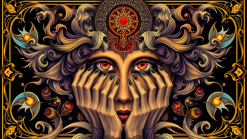 Award winning illustration, ultra realistic, tarot card, ornate, Celtic, art nouveau, symmetrical, back lit, 16k, UHD, HDR, intricate details, mystical aura, ethereal elements, flowing patterns, harmonious composition, deformed iris, unusual pupils, enigmatic eyes, cloned faces, surreal fingers, unique hands, abstract elements, mysterious charm, vibrant colors, seamless design, evocative atmosphere, creative essence, whimsical balance, otherworldly vibe, fantastical vision, captivating presence, magical allure, enchanting depiction.
