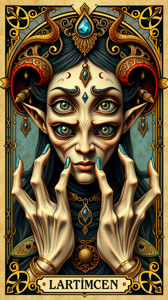 Award-winning illustration, ultra-realistic tarot card, ornate Celtic art nouveau, symmetrical and backlit with 16k UHD HDR quality, featuring a character with unique and intriguing features such as deformed iris and pupils, unusual eyes, and a cloned face. The figure has extra fingers and creatively styled hands, all presented in a captivating composition. The artwork avoids being cropped or low resolution and is free from text, JPEG artifacts, signatures, watermarks, usernames, artist names, trademarks, and titles. The design is contained within the frame, avoiding reference sheet elements and exaggerated features like long necks.