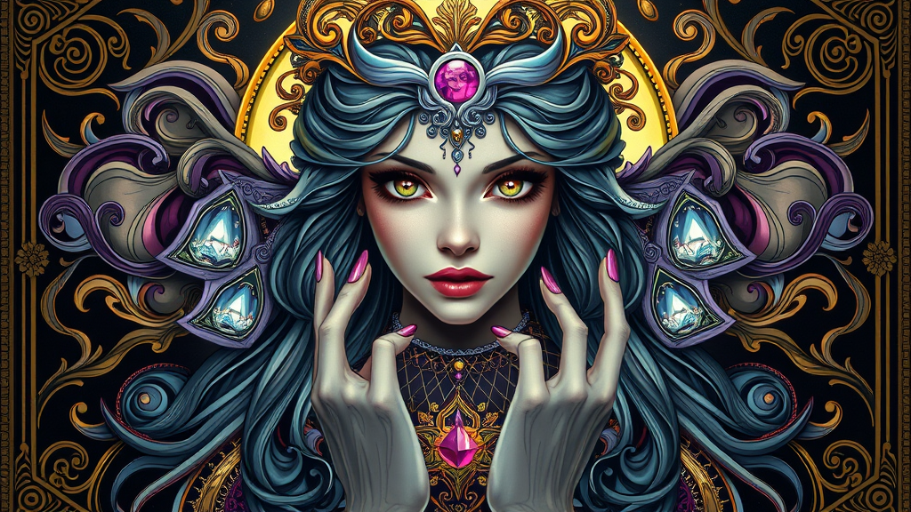 Award-winning illustration, ultra-realistic, tarot card, ornate, Celtic, art nouveau, symmetrical, backlit, 16k, UHD, HDR, detailed figure with ethereal elements, intricate patterns, mystical atmosphere, enchanting eyes, expressive gaze, unique facial features, elegant hands, harmonious composition, flawless rendering, vibrant colors, vivid details, seamless integration, immersive design, rich textures, captivating visual storytelling, artistic allure, timeless elegance, symbolic imagery, fantasy-inspired ambiance.