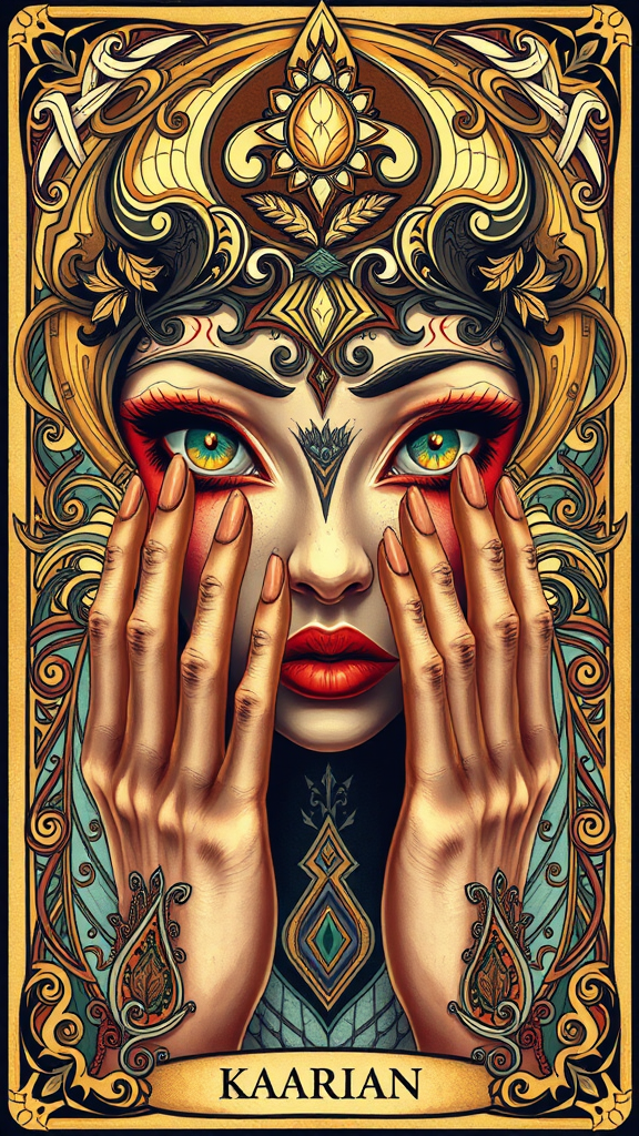 Award-winning illustration, ultra-realistic, tarot card, ornate, Celtic, art nouveau, symmetrical, backlit, 16k resolution, UHD, HDR, featuring intriguing eyes with unique patterns, abstract facial features, surreal hands with an artistic twist, focus on detail without typical distractions like watermarks or signatures, elegant and mystical elements, ethereal atmosphere, harmonious color palette, bold composition emphasizing fantasy and myth, luxurious textures, and a magical interplay of light and shadow.