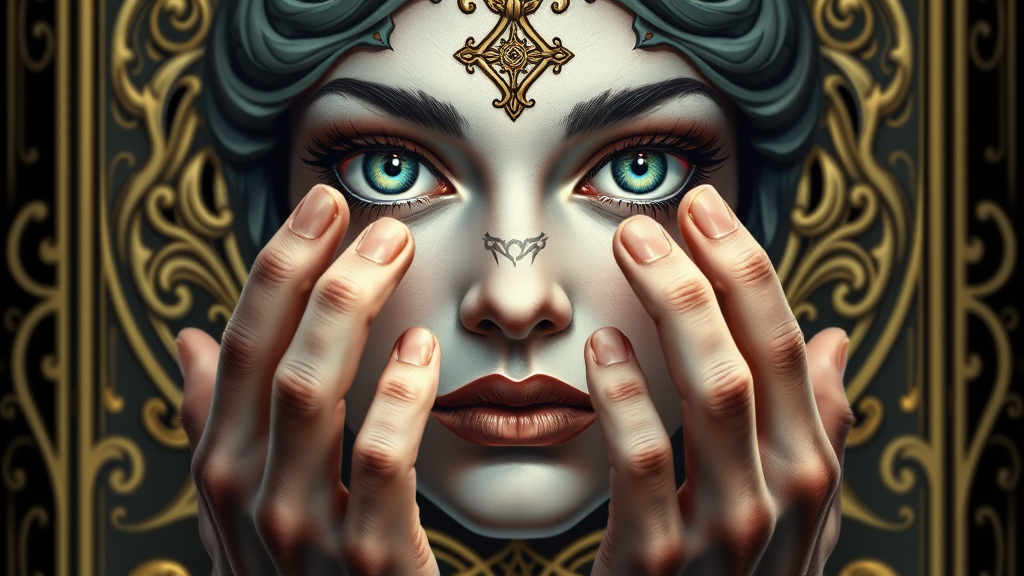 Award winning illustration ultra realistic tarot card ornate Celtic art nouveau symmetrical back lit 16k UHD HDR unique iris unique pupils captivating gaze distinct face expressive hands detailed fingers harmonious composition seamless edges high resolution clarity devoid of text pristine image timeless beauty flawless detail elegant mysterious ethereal essence